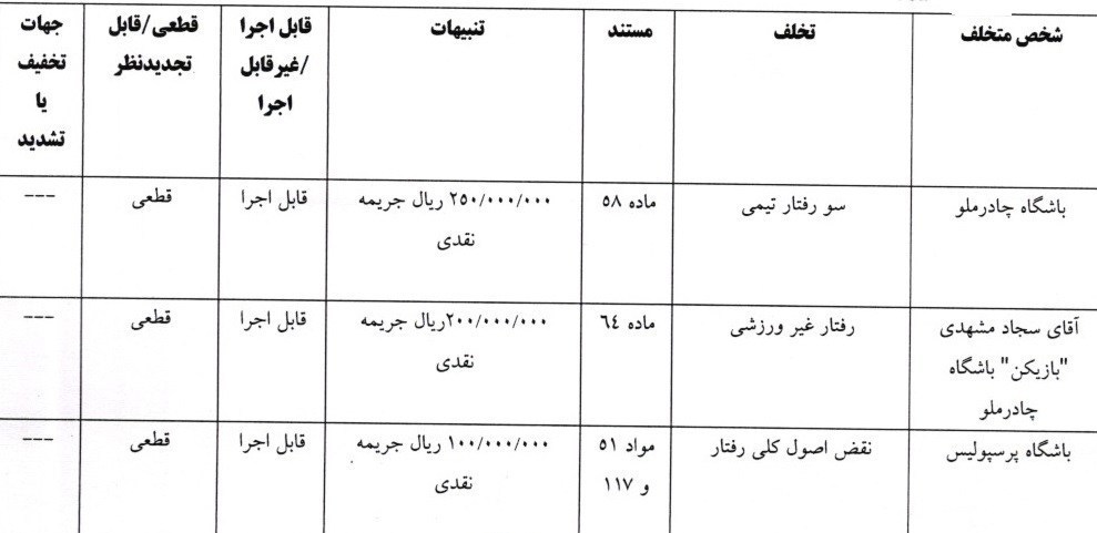 رای تخلفات مشهدی و تیم چادر ملو و همچنین تیم پرسپولیس به شرح زیر است: باشگاه پرسپولیس بابت نقض اصول کلی رفتار 10 میلیون تومان جریمه نقدی شد. ماده 51 به رفتار غیرورزشی، اعتراض به داور یا تاخیر در ورود به زمین اشاره دارد.