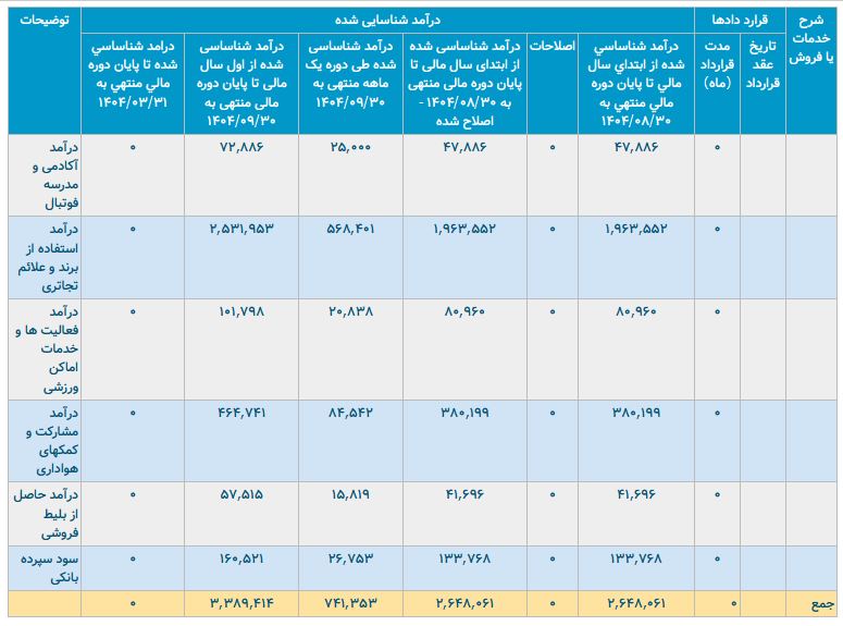 باشگاه پرسپولیس طی عملکرد ۱ ماهه منتهی به ۱۴۰۴/۰۹/۳۰ معادل ۷۴۱,۳۵۳ میلیون ریال، معادل ۷۴ میلیارد تومان درآمد داشته است و در مجموع تا پایان ماه آذر، میزان درآمدهای پرسپولیس به ۳۹۰ میلیارد تومان برسد.