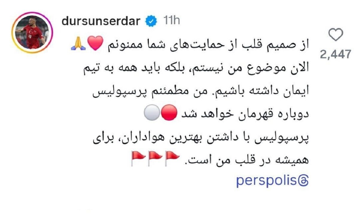 سردار دورسون از پرسپولیس جدا شده اما همچنان نتایج این تیم را دنبال میکند و حتی به آن واکنش نشان می دهد.