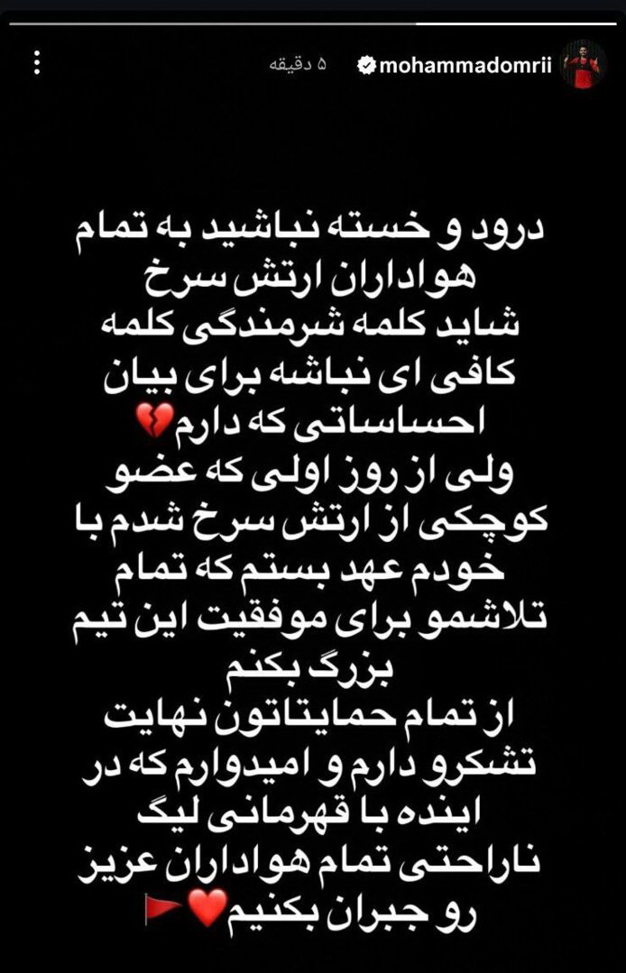 درود و خسته نباشید به تمام هواداران ارتش سرخ شاید کلمه شرمندگی کلمه کافیای نباشه برای بیان احساساتی که دارم ولی از روز اولی که عضو کوچکی از ارتش سرخ شدم با خودم عهد بستم که تمام تلاشمو برای موفقیت این تیم بزرگ بکنم. از تمام حمایتاتون نهایت تشکرو دارم و امیدوارم که در آینده با قهرمانی لیگ ناراحتی تمام هواداران عزیز رو جبران بکنیم.
