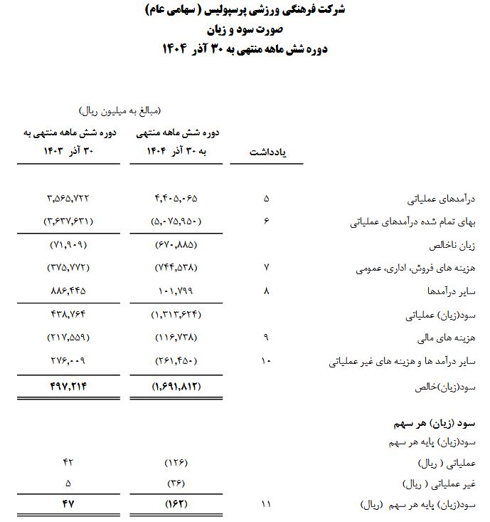 باشگاه پرسپولیس صورتهای مالی خود در دوره ششماهه منتهی به ۳۰ آذرماه ۱۴۰۴ را در سایت کدال افشا کرد.