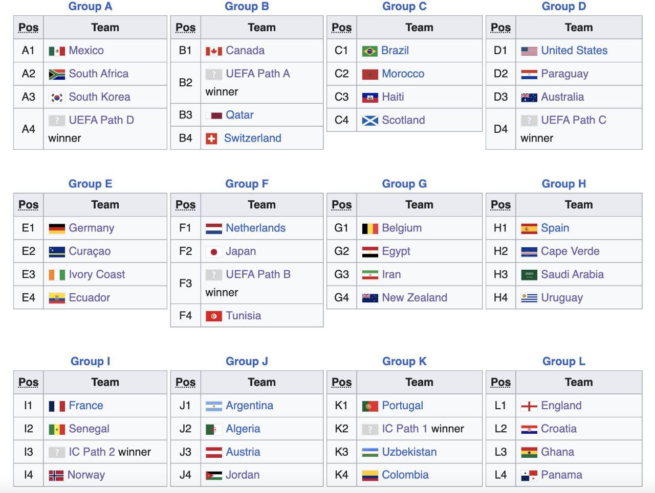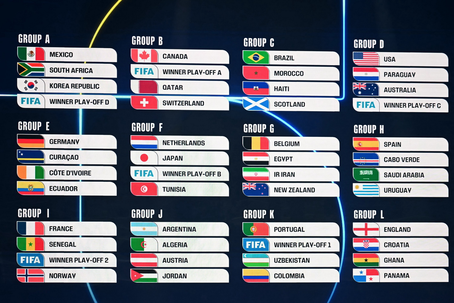 بر اساس قرعهکشی، گروههای دوازدهگانه (46 تیمی) جام جهانی 2026 به شکل زیر مرتب شد: