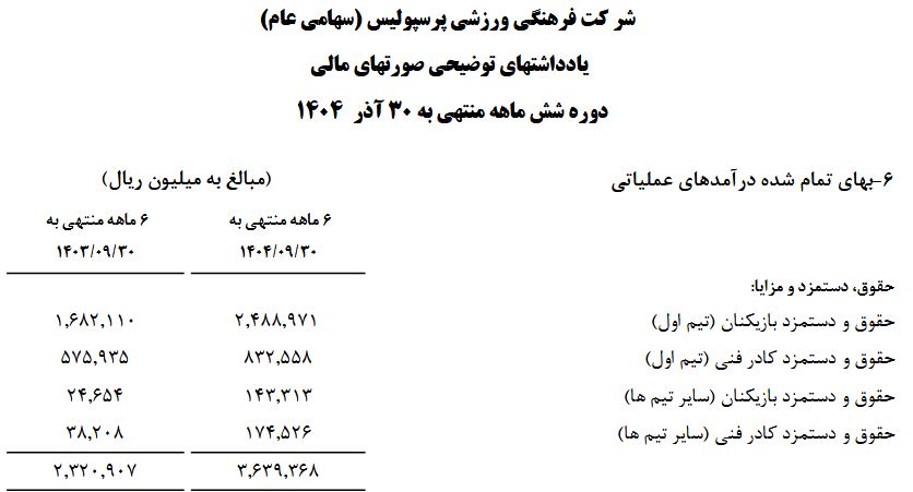 براساس این سند، حقوق پرداختی باشگاه پرسپولیس به بازیکنان تا شش ماهه منتهی به ۳۰ آذر ۱۴۰۴، ۲۴۹ میلیارد و حقوق پرداختی به کادرفنی ۸۳ میلیارد تومان بوده است.