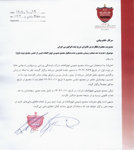 مجمع عمومی پرسپولیس در تاریخ دهم دیماه به حد نصاب نرسید و نامه این مجمع به سامانه کدال ارسال شد.