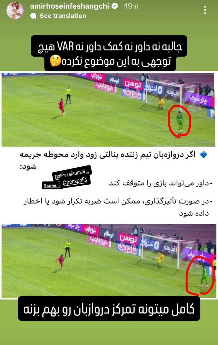 فشنگچی در همین ارتباط در استوریاش نوشت: «جالبه نه داور نه کمک داور نه VAR توجهی به این موضوع نکرده. کامل میتونه تمرکز دروازهبان رو بهم بزنه.»